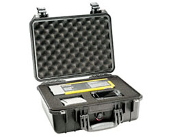 Pelican 1450 shipping carrying airtight watertight case is constructed of light weight structural resin with a polymer sponge o-ring seal and exclusive purge valve. Pelican supplies complete with pre-scored Pick 'N' Pluck foam (no cutting required). Pelican Protector Dry Boxes also feature locking flanges, massive multiple latches for absolute security and a comfortable molded fold-down handle.